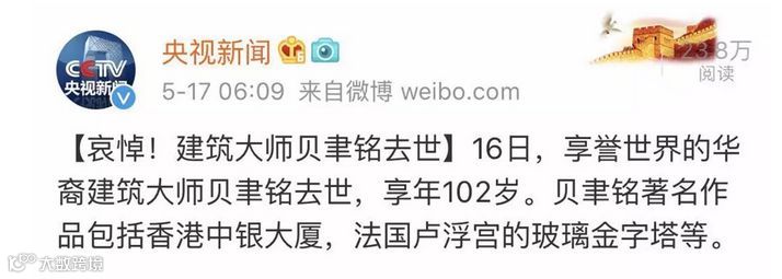 据央视新闻报道,享誉世界的华裔建筑大师贝聿铭5月16日去世,享年102岁。