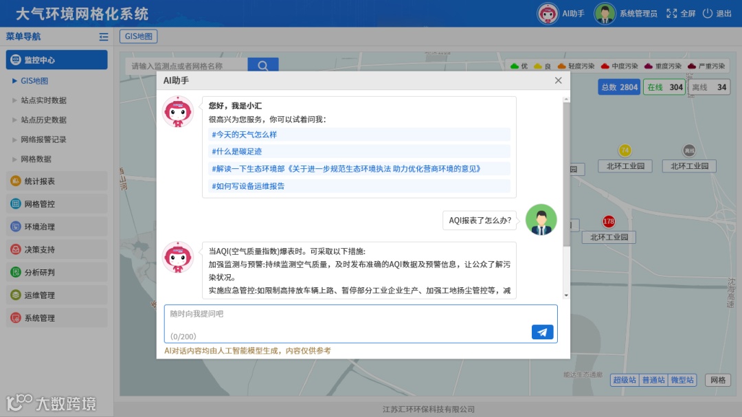 汇环科技在大数据、人工智能等领域拥有长时间的技术积累,已经将 DeepSeek技术深度植入自主研发的智慧环保系统中,成功打造出独具特色的 AI 智能助手 ——“小汇”,开创了技术与环保业务紧密融合的全新局面。
