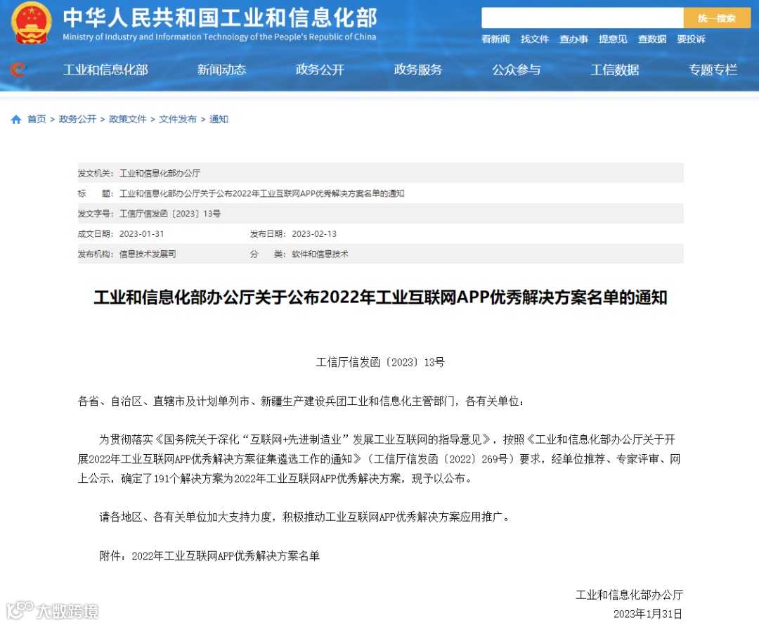 2023年1月31日,工业和信息化部办公厅发布“关于公布2022年工业互联网APP优秀解决方案名单的通知”。