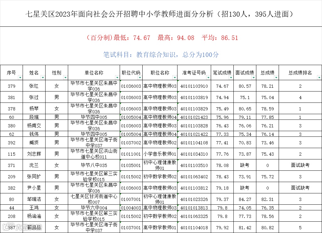 毕节市七星关区公开招聘中小学教师笔试成绩公布