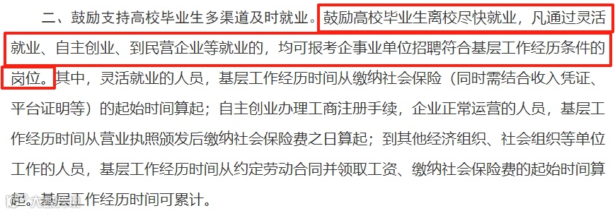 ★基层经历条件放宽:灵活就业、自主创业、到民营企业就业的,均符合事业单位基层经历条件。