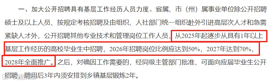 ★应届生直接考编通道缩窄:通知发布后,非硕士应届生报考省市事业单位将受限制(仅“特殊急需岗位”可招应届生,且录用后需下乡锻炼2年)。