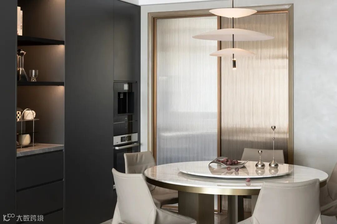 餐厅作为一家人的进食场所,它的设计不仅仅关乎整个家的风格,也影响着用餐的氛围与心情。设计师通过打磨立面结构的完整度,让每一个画面都有其整体的控制性。深灰色的肤质感餐柜面板带来稳重柔和的氛围,精致的线条分割由客厅延伸至厨房,让空间更显开阔。