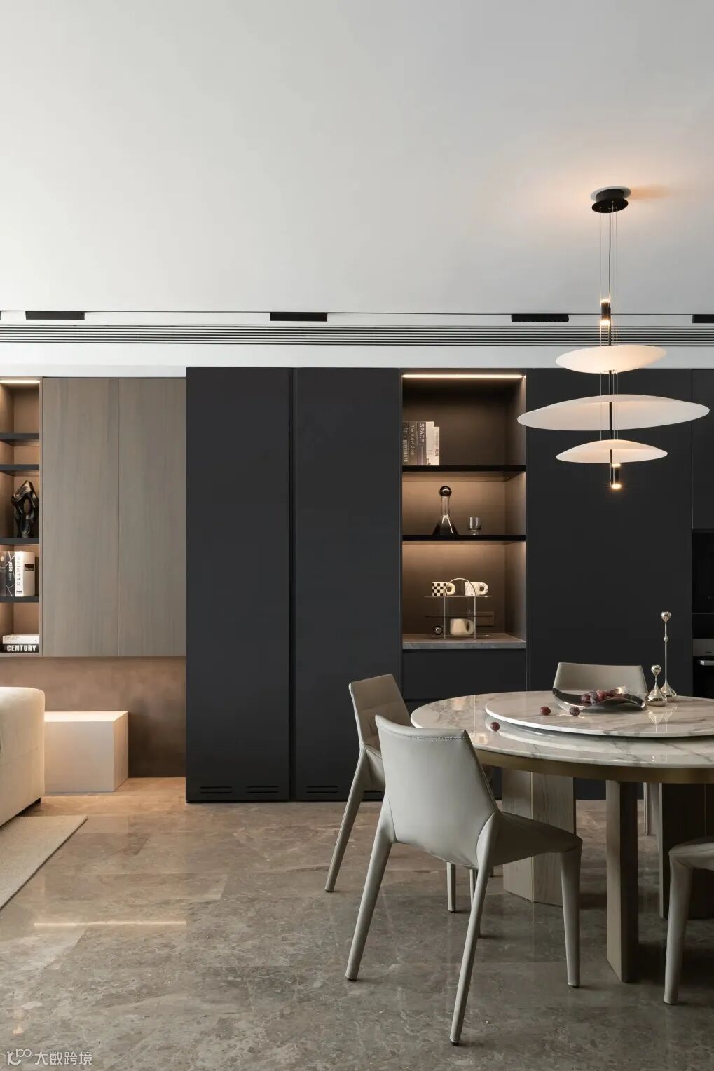 整个餐厅系统里,低调内敛的高级灰营造出极致的时尚感,而其它的细致部件则以金属元素活络起空间脉搏,勾勒出意式高雅格调的美好模样。