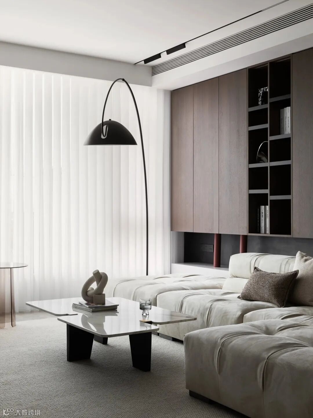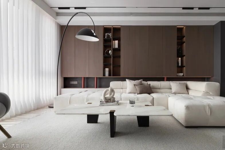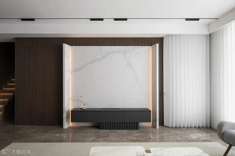 电视背景墙以深胡桃木色的木格栅作铺设,辅以高端的白色岩板搭配,一深一浅的对比,拉伸了空间的张力,契合了意式极简的主体气质。