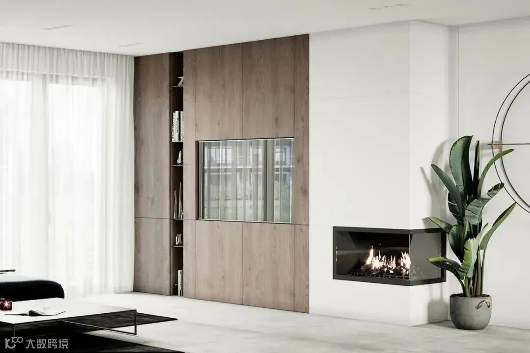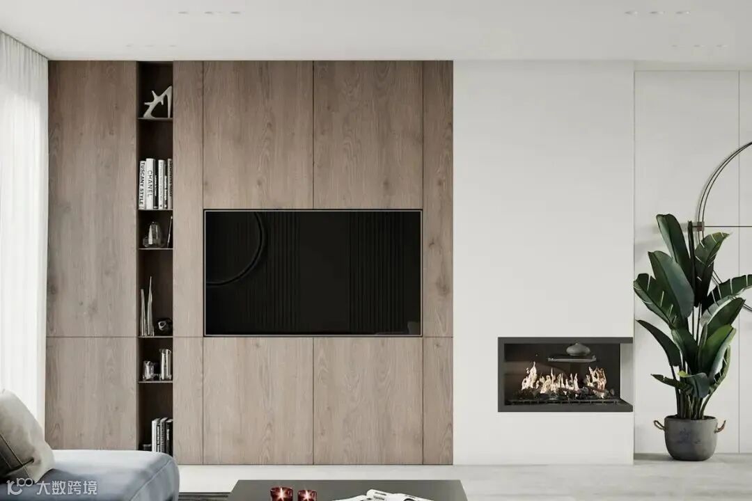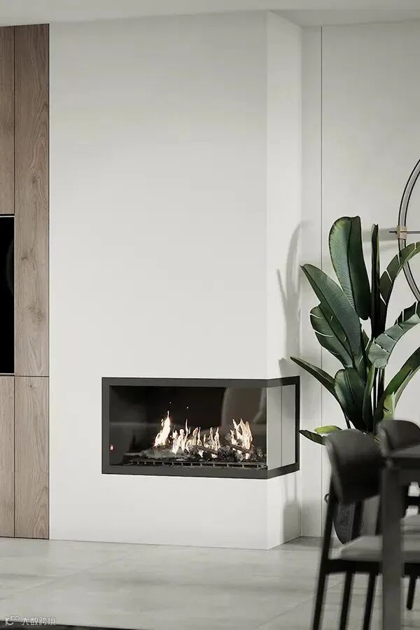 为了避免大面积的留白会给人疏离感,设计师以木色的电视背景墙来点缀平衡视觉,同时拥有储物空间,墙角的壁炉增添了一丝活力,动静结合。