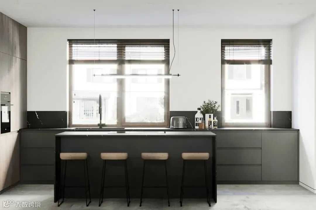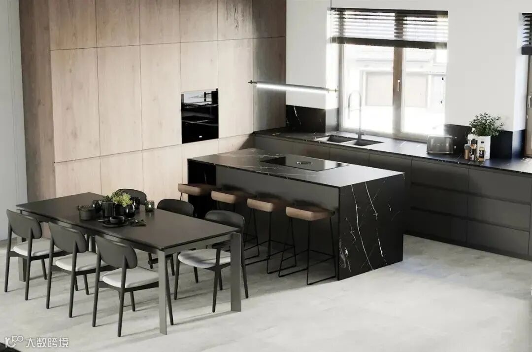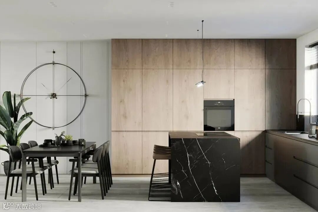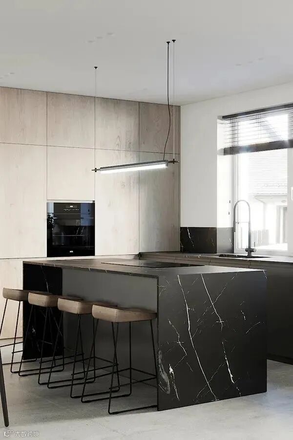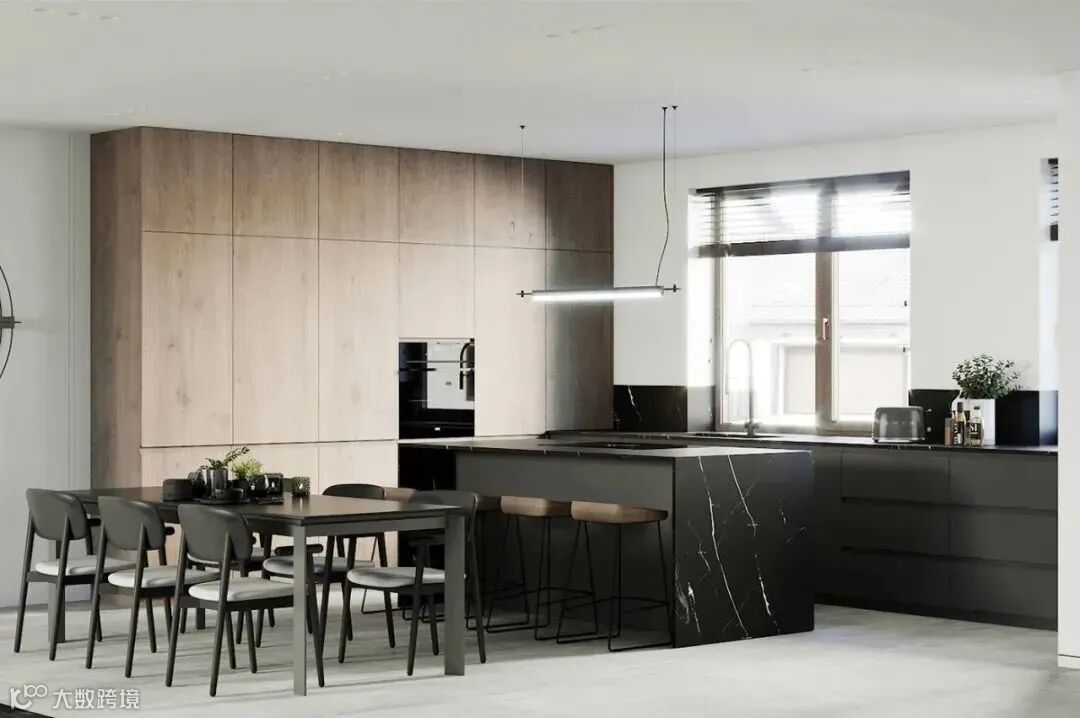 黑色的岛台和操作台,木色的橱柜,窗外的光线与木质元素,为这里增添了活力与生机。