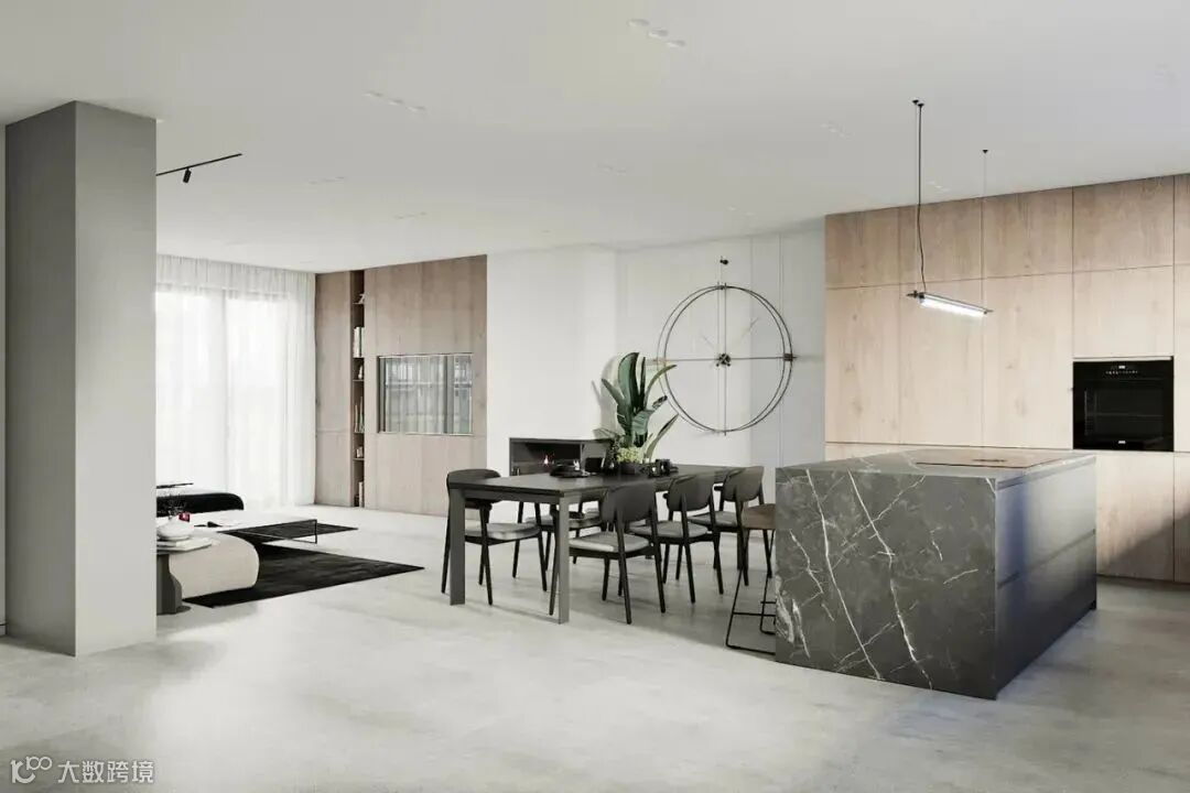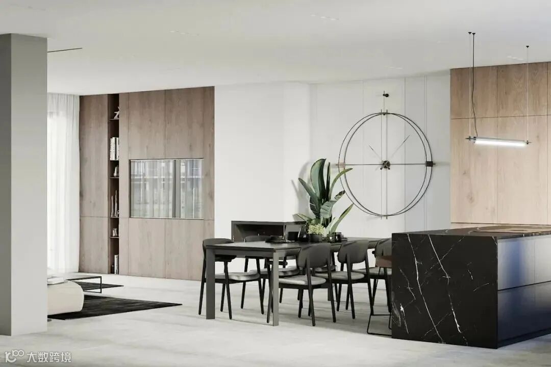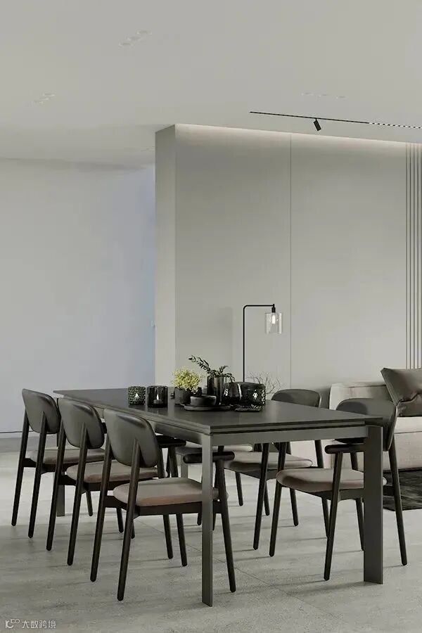 餐厅和厨房在同一个区域,黑色的餐桌搭配同系列餐椅,足够宽敞的面积让每一功能区都显得舒适有余。