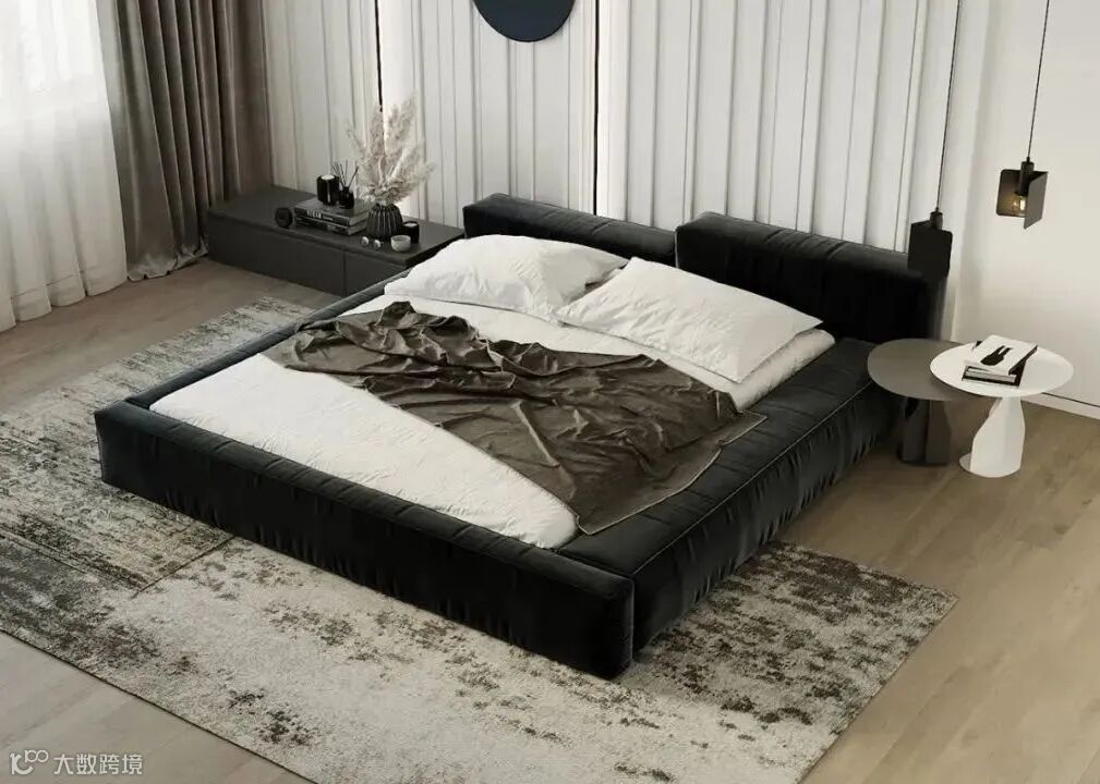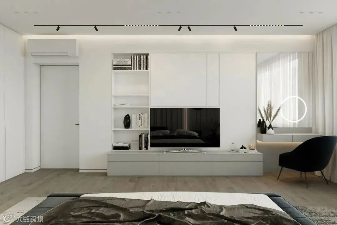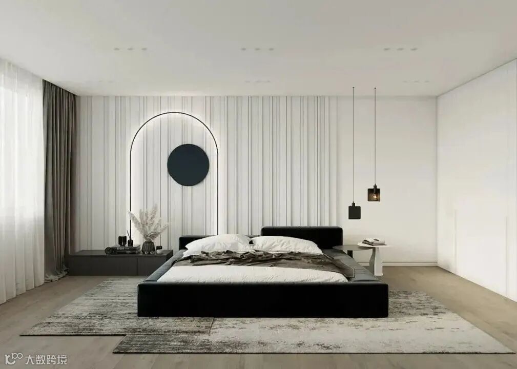 在大面积白色的主卧里,黑色的床品分外显眼,格栅元素的床头设计,打破了纯色空间中的单调,带来了一丝柔美与梦幻。