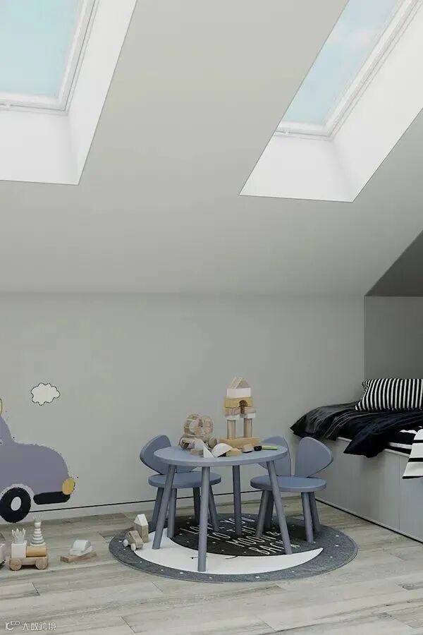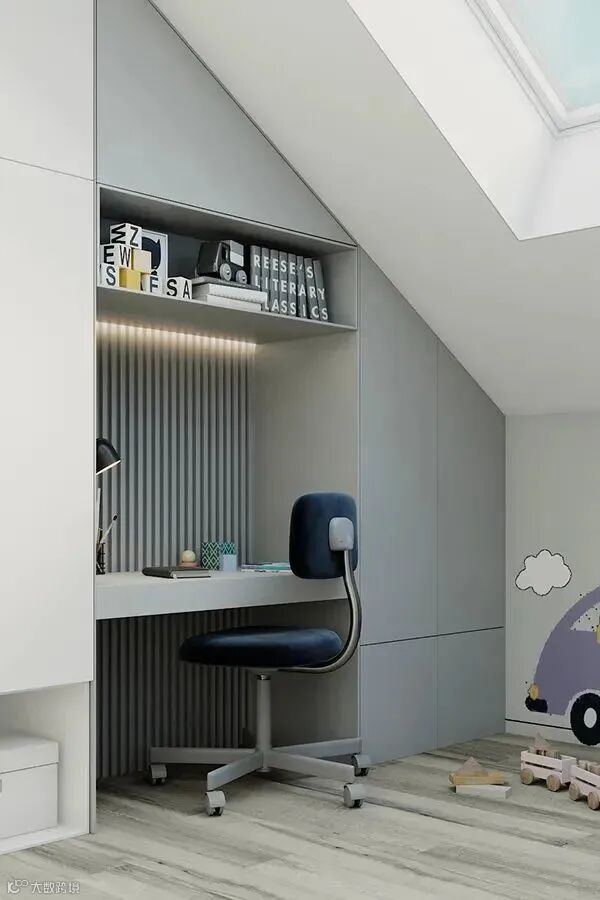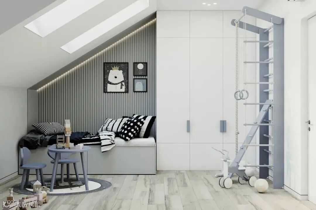 男孩房采用浅蓝色,好像清爽的海水一样洗涤孩子的心灵,设计动感十足,充满趣味性。