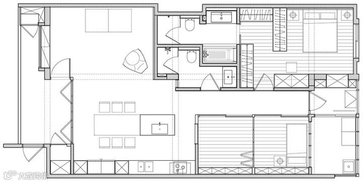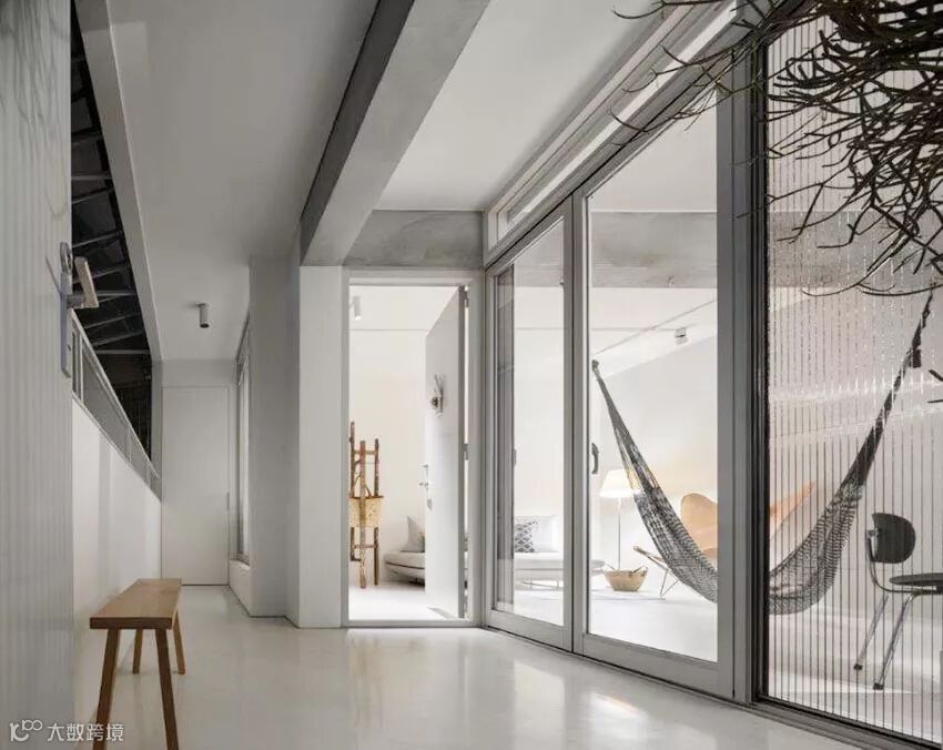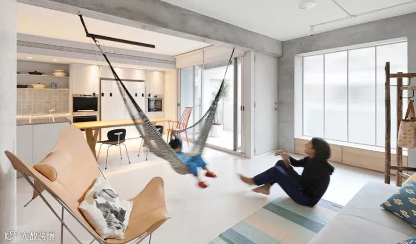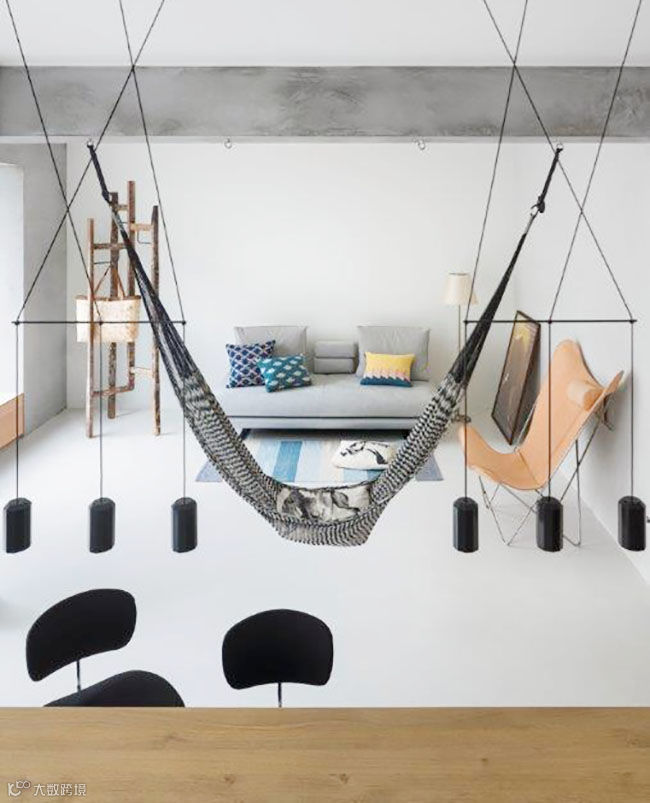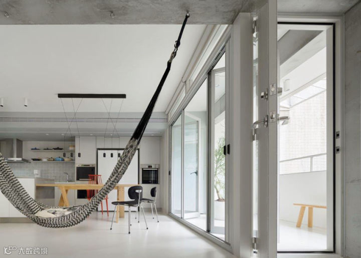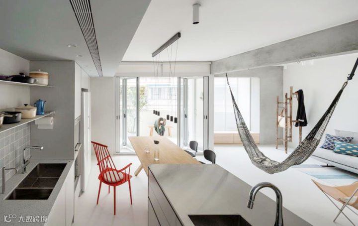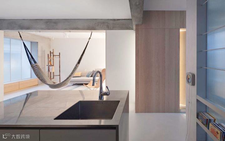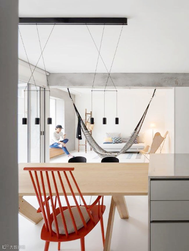 主要生活的客厅、餐厅与厨房连结而成为开放式区域,巧妙将收纳隐藏起来,家具变成灰色区域里明亮的主题,特别是台湾屋主少用的吊床,满足孩子与大人童心未泯的状态。也因为有了吊床,客厅只需要再多放一张两人座沙发与皮革设计单椅,增加不少活动地坪。