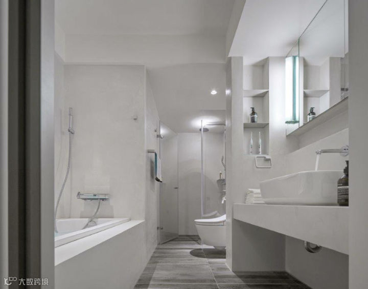 呼应整体居家简约质感规划,两坪浴室和客厅地面一样使用卡多泥材质,因为本身不防水,多加了一道防水手续,地板则是选择木纹砖,在一片灰色的彩度中营造出温暖氛围。