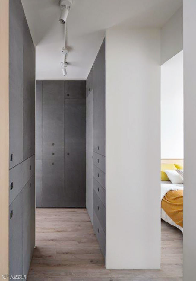 从阳台进入至公共区域,很难看到收纳踪跡,设计师主要利用樑下或隐密的藏于墙面,譬如说玄关入口便有木作收纳柜,除了鞋子还能摆入屋主的露营用具,小孩房也有整面墙的收纳柜。此外位于走道底部,特意增设独立衣物间,如同欧美居家,可以在小空间里整理刚洗好衣物、烫衣服,甚至收纳较为大型的电器。