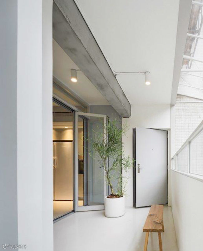 这间快要 40 年的老屋原本没有阳台,为了增加采光以及改善室内公共区域视觉感受,因此决定创造类似斧头形状的阳台,让原本地坪退缩约 1 米 8(最宽的地方),透过空间改变,接触到的不再只有墙壁,而是更多与户外连结的阳光、绿景,同时也能创造良好通风环境,而且进出阳台的通道,采用可以全部打开的折门,随时能放大家中客厅区域。