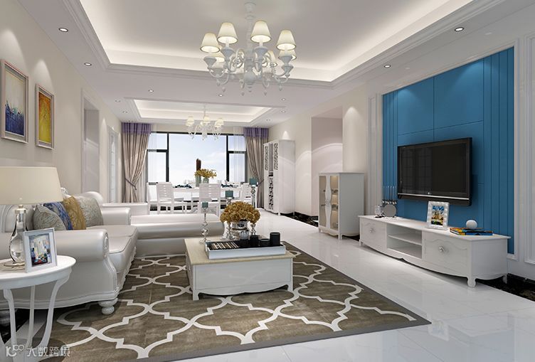 米色、白色、淡黄色、浅蓝色搭配在一起,温柔可人。独特的吊灯设计,更显别具匠心。