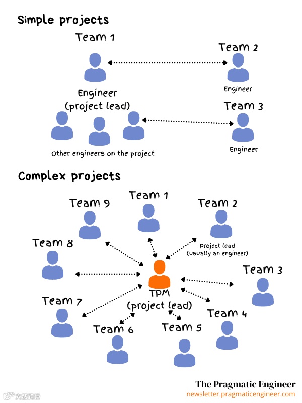 复杂项目往往涉及多个办事处和时区的多支团队,领导这样的项目将是某位工程师的全职工作。科技巨头会聘请技术项目经理(TPM)来管理这些复杂的,而且往往是战略性的项目,从而减轻工程师的负担。
