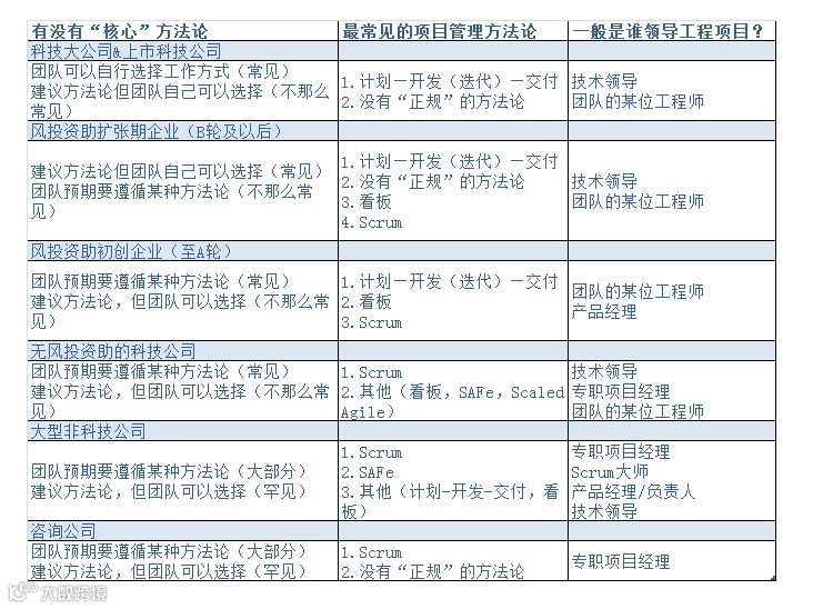 Scrum:在大型非科技公司、非风投型公司和咨询公司中比较常见。