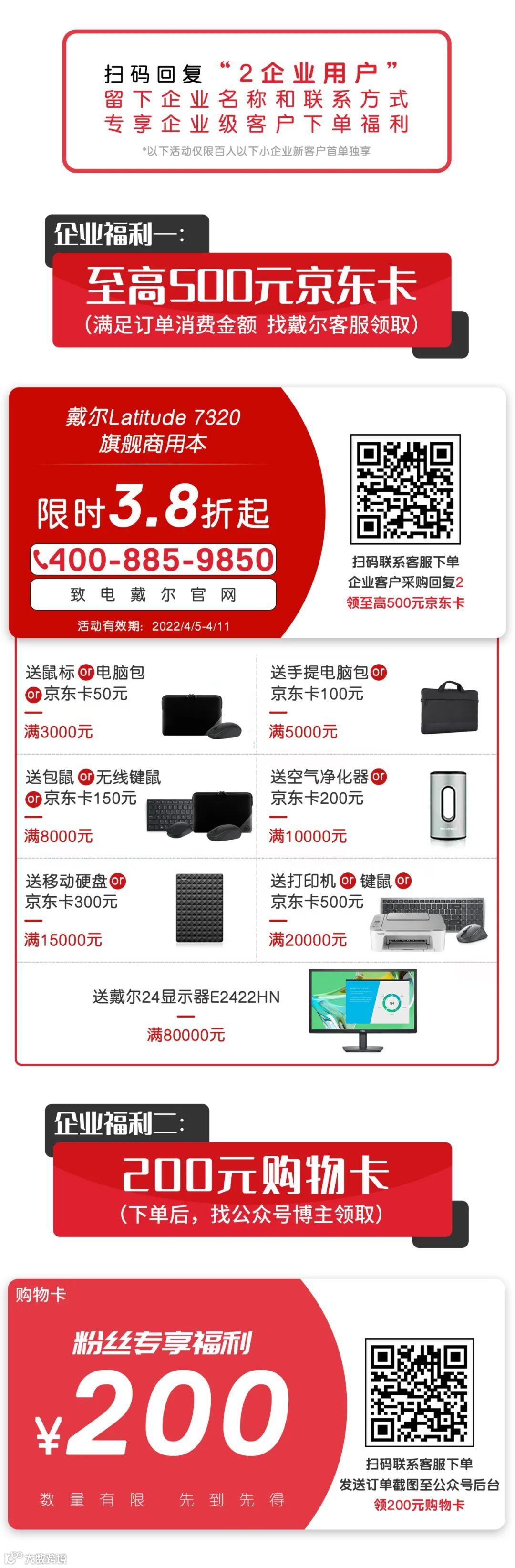 ,联系戴尔官网客服下单,享至高500元满赠礼包,再加200元粉丝福利卡!