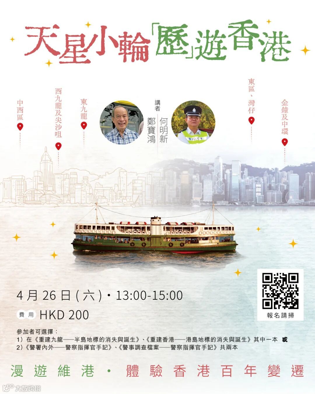 本次遊覽特邀星級導賞員鄭寶鴻、何明新領航。鄭寶鴻是素有「香港記憶守護者」美譽的著名收藏家及地方志專家,透過搜集舊報刊、歷史相片、廣告傳單等珍貴文獻,並結合口述歷史與親身見證,以寫作完整記載香港城市發展的歷程。