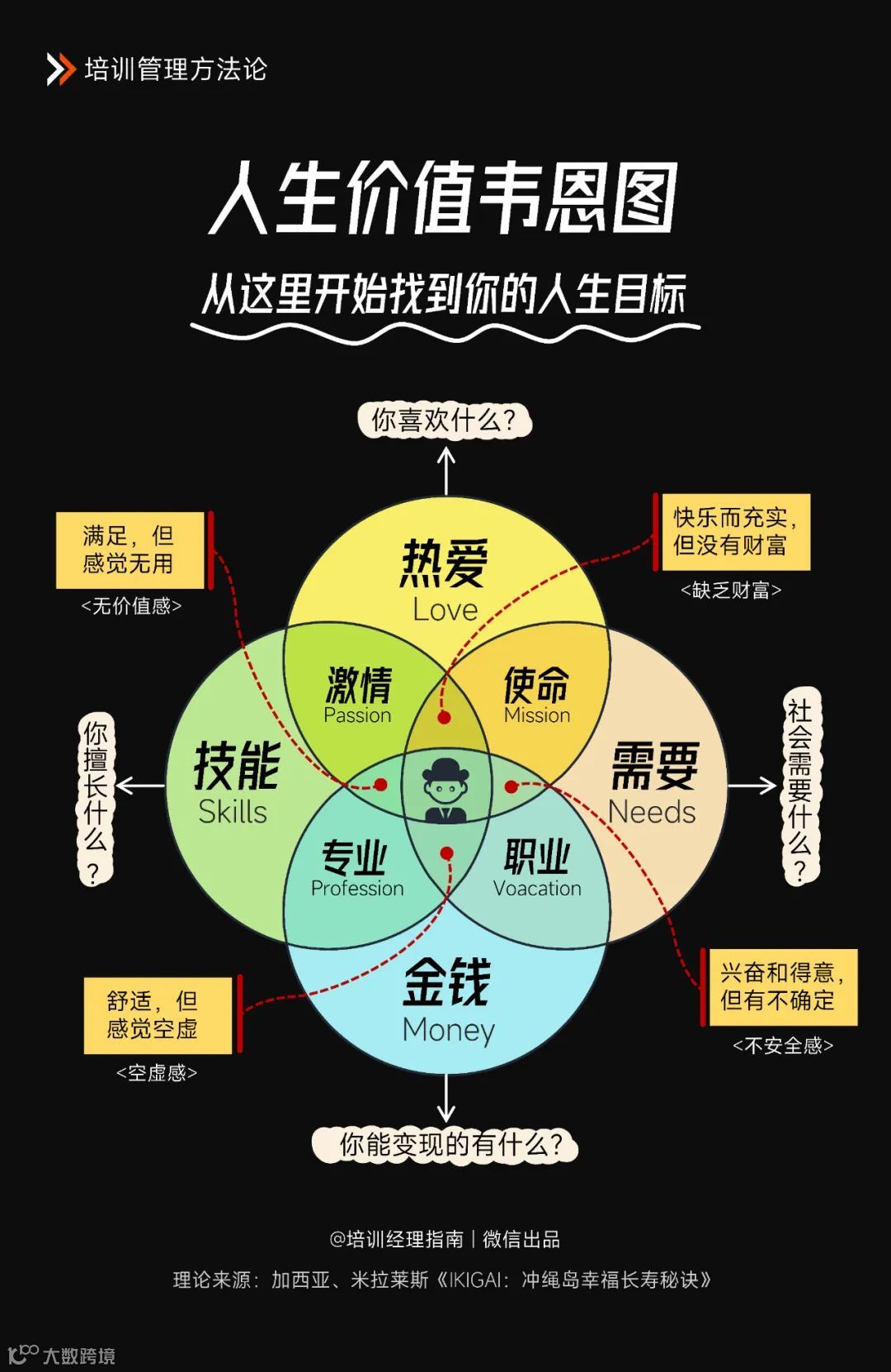埃克托尔•加西亚与弗兰塞斯克•米拉莱斯在《IKIGA:冲绳岛幸福长寿的秘诀》中提到了“IKIGAI”理念,意为“人生的意义/价值”。为了人们能更好地理解“IKIGAI”,它通常以韦恩图的形式,可视化地呈现在大家面前。在这里,人们也习惯性地把它称作“人生价值韦恩图”。这个模型由四个部分组成: