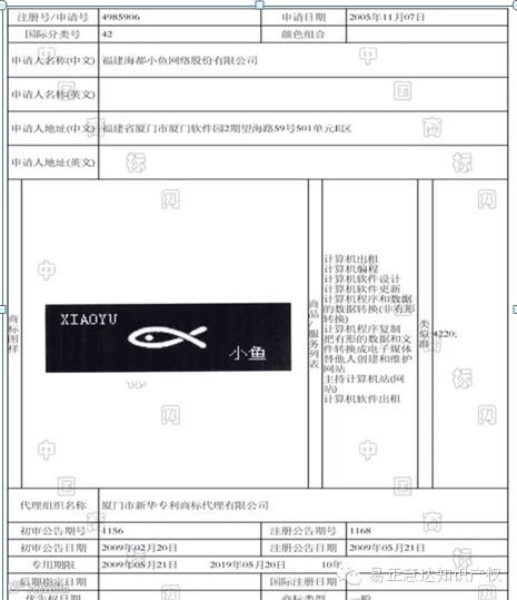 福建海都小鱼网络股份有限公司于2005年11月7日在42类申请“小鱼”商标(小鱼、图形、XIAOYU),于2009年5月21日注册成功。因与该商标核定的服务相近,北京小鱼儿科技有限公司申请的42类商标有可能被驳回。具体信息如下图: