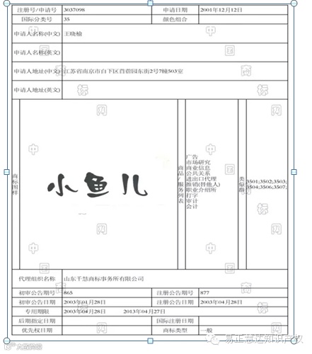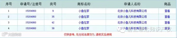 “小鱼儿”商标的注册会影响在后企业名称的使用,同时北京小鱼儿科技有限公司申请的35类商标有可能被驳回。具体信息如下图: