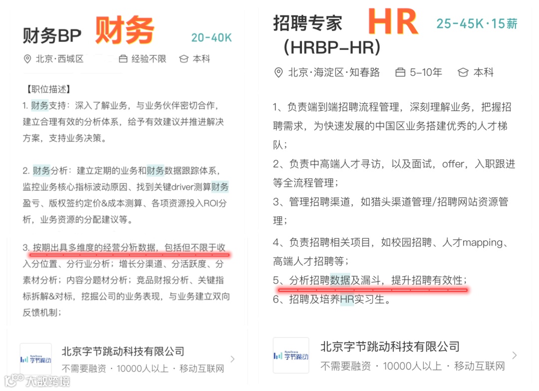 我从招聘网站爬取了字节跳动9600余条岗位数据后发现,上到专家级别,下到最基层员工,从产品、运营、销售,到财务、HR,80%岗位的JD,都不放过强调要掌握「数据分析」能力。