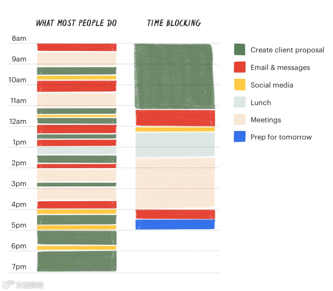 时间块是一种时间管理方式,它主要是要求你将一天的时间切分为若干个时间块。每个时间块只安排一项具体的任务,或者任务组。通过这种方法,你将不再面对没完没了的待办事项清单,每天面对的都是具体的任务计划,让你清晰地知道什么时候该做什么事情。