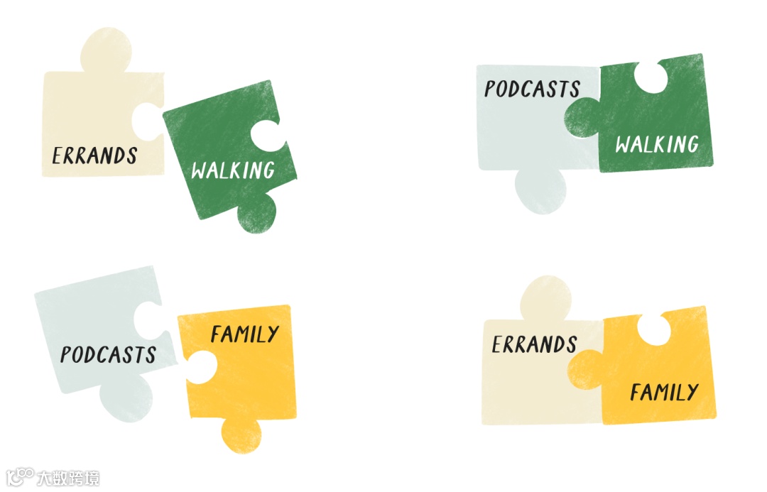 同样地,当你通过散步来放松自己、保持健康的时候,也可以收听播客节目,探索求知欲,或者听着最喜欢的喜剧节目大笑出来。总之,你可以思考一下自己可以同时捆绑完成哪两项任务。