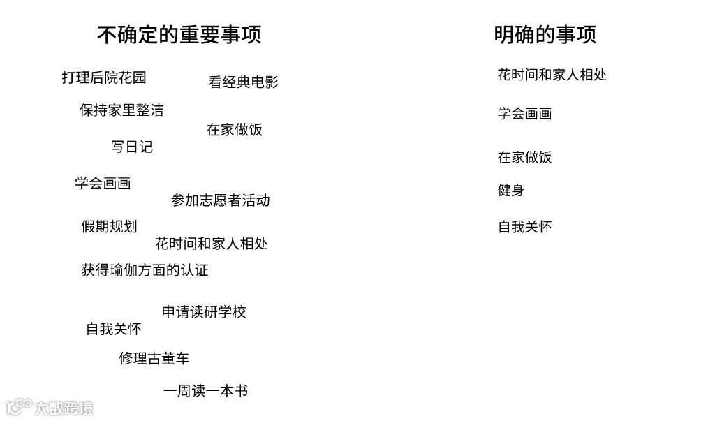 对于你想完成的事情,你可能会列出一个很长的清单。但如果每件事都是重要事项的话,就实际上重要事项也就没有任何意义了。太多的事项只会让我们无所适从,反而失去了重点,不可避免地导致“分析瘫痪”(analysis paralysis)。