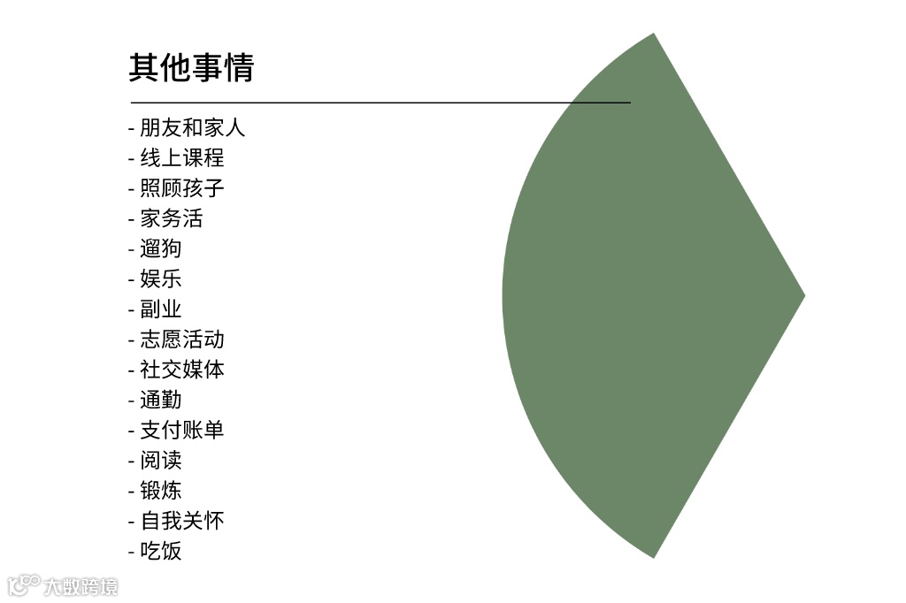 如果希望明确自己的重要事项,你可以直接看看自己的时间都花在了哪些方面。可能你认为自己以学习为主,但通过时间审计后发现,过去了这么多天,网课仍然没有上完,或者床头柜上的书仍然没有开始读。而时间管理的目的,就在于让你能够在实际过程中优先完成自己明确的那些重要事项。