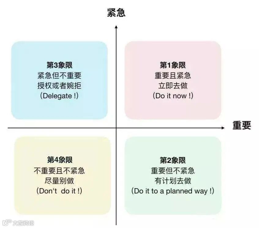 这张图,是很多时间管理课程都会涉及的一张图,从重要程度和紧急程度两个维度,将事情分为四个类别。