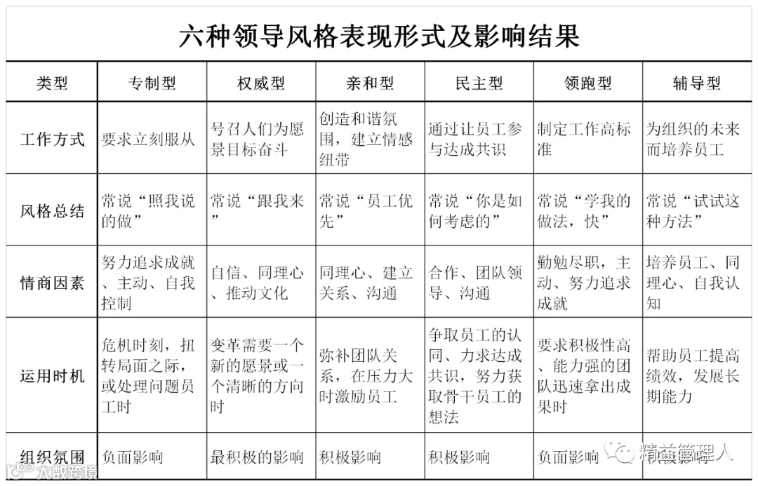 特别是如果领导者能根据组织的具体情形,在权威性、亲和型、民主型和辅导型之间自如切换,就可以创造出最佳的组织氛围、最大程度地提高组织业绩。