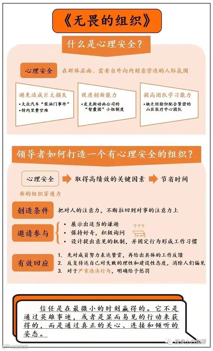 心理安全并不是个人自内而外的一种工作品质,而是一种在群体层面、需要自外向内刻意营造的氛围。领导者的可贵之处就在于:敢于暴露自己的无知,交付一个值得信赖的人格。