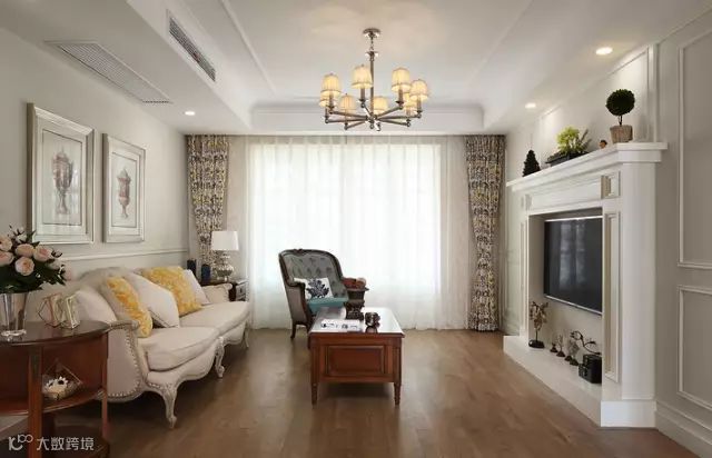 安装双控开关控制客厅灯,方便使用,特别注意电视机与沙发两边五孔插的位置与数量,便于电视机、落地灯、饮水机等电器的使用,如果想买角几的业主还得考虑此处的插座布置。