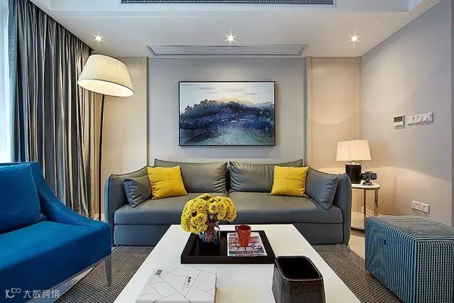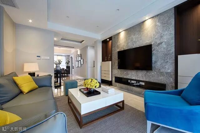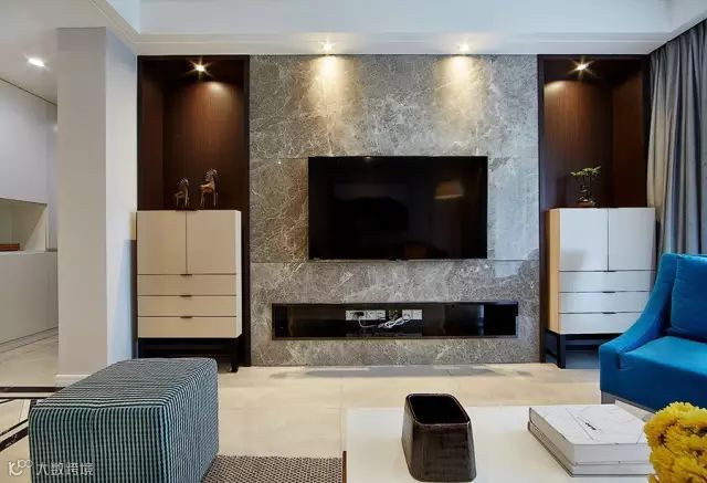 色彩冷静,对色彩搭配还是比较满意的,只是电视柜两旁的柜子感觉有些多余了,应该把电视墙主要部分中间灰色大理石面向两旁扩宽一些,两旁留两条窄一点的搁架或许会比现在这样更好一些。