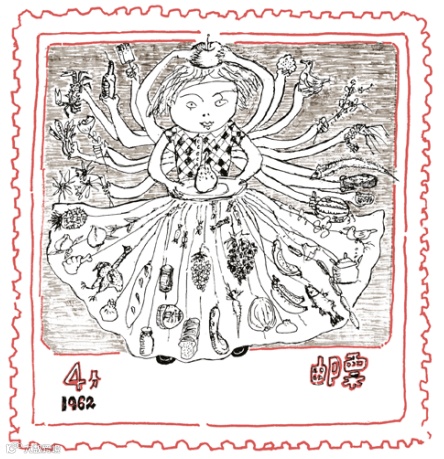 《繁花》有一幅1962飢餓年代郵票圖。原是畫在《上海文學》便箋的草稿,紙很差,又透。隨手畫了小姑娘的面孔,覺得可愛,圓圓的,蘋果一樣,直到再畫這一張面孔,肯定畫不出來了。所以經常隨手一畫,發現很好,不另外起稿,直接貼一張大白紙上,仔細畫下去。《繁花》插圖很多都這樣,畫在用過的紙背面,沒有一張是新紙,都是無意識起頭,偶然畫的。