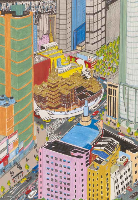 《靜安寺》畫了好久,無意中越畫越細,時間拖得很長。過去一直不知道會這麼認真,這麼細,一旦畫起來才發現那種心情:我要仔細畫了,沒辦法一蹴而就啊,今天不行了,沒辦法畫完了,第二天繼續……有些畫到最後,又變成版畫味道,有人問《靜安寺》這兩隻手什麼意思?是印度佛像的手,戴特別的手鐲,盤子端來廟宇的意思。這一帶可都是新造的,我畫它才醒悟——整個靜安寺,全部是新造的了,我這老上海也剛發現,除了近景百樂門舞廳那著名的灰藍色塔尖,畫裡所有建築,都是逐年新做的,曾經的老靜安寺地區,已經不存在了,只有孤零零的「百樂門」以及(畫面夠不上)靜安公園正門兩排大梧桐、畫外遠處張愛玲故居這老三樣,老靜安寺是全部拆光了,看上去這麼熱鬧。這是我對風景的理解。