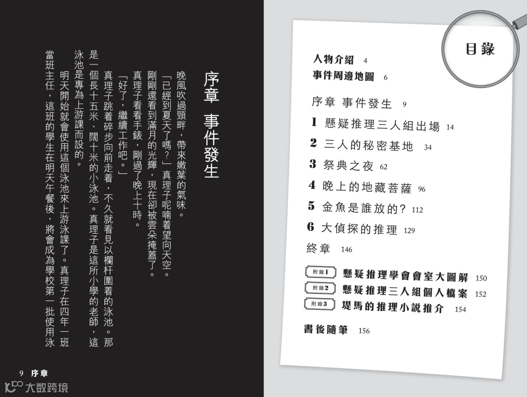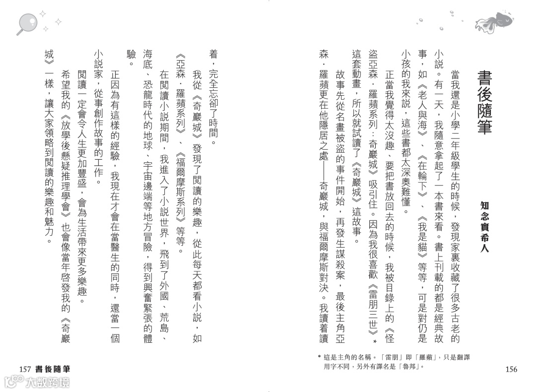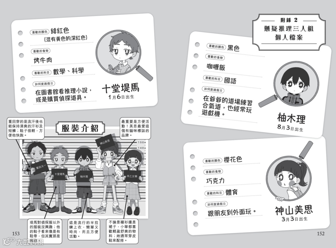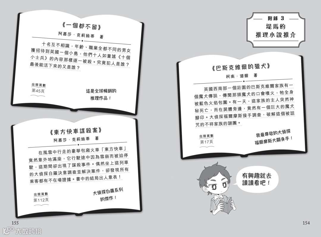 每冊書均有附錄,讓讀者對書中內容更為了解,同時又可獲得額外的資訊和知識。此外,本書更為讀者介紹世界各地的經典推理小說,也有作者的書後隨筆,及想與小讀者說的話。