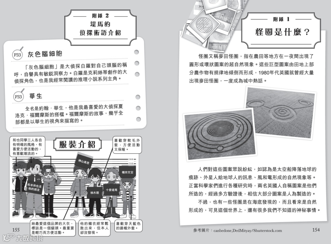 第二冊附錄有關於怪圈和偵探術語的介紹和解釋,幫助小讀者對是次事件有更深認識,而且謎團的怪圈也取材自真實事件,小讀者可有更深印象。