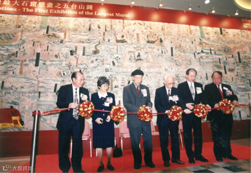 圖 | 1999年在香港舉辦(發現敦煌世界一全球首展最大石窟壁畫之五台山圓),開幕式上,陳萬雄、樊錦詩、段文杰、饒宗頤、李祖澤等人剪綵合影。