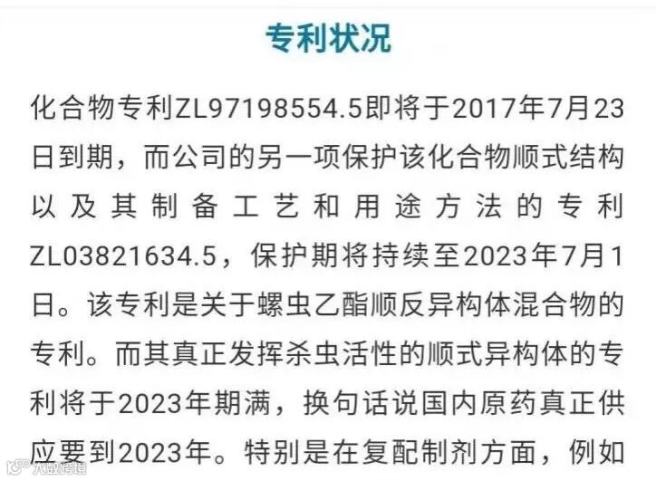 第一,自从2017年7月23号拜耳顺反异构体到期后,国内有大量登记和原药生产,但是真正发挥效果作用的顺式异构体2023年7月1号才到期,新长山洪威采用拜耳顺式异构体原药。