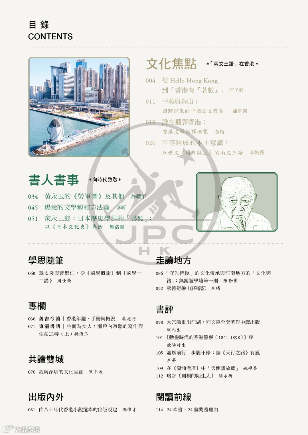 本期「文化焦點」主題為中環的建築與城市地景,作者們分別從建築面向與面相、建築空間與資本以及文學、繪畫、攝影等角度描摹中環地區。「書人書事」致敬作家西西、歷史學家馮天瑜先生、翻譯家和作家劉紹銘先生、嶺南畫派大師楊善深先生。「專欄」繼續有林沛理先生的「西書閑話」和蔡思行先生的「古書今讀」。「共讀雙城」邀請尹昌龍先生撰文,回望沙頭角的歷史煙雲。「出版內外」有黃天先生分享日本的神保町書店街和神田古本祭,以及中文大學出版社編輯分享劉統先生著作《長征》的出版故事。「書評」評介5本港版好書。「閱讀前線」分享24本最新出版的好書信息。
