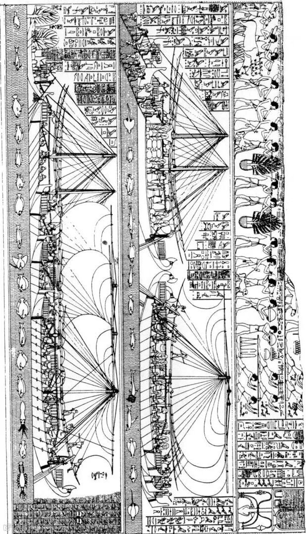 古埃及的海船不是紙莎草船,而是木船。前些年,埃及考古工作者和歐洲古船專家根據此壁畫和出土船木、繩索等線索,復原了一艘與壁畫一樣的紅海古帆船。英國BBC電視台還為此拍了一部紀錄片。