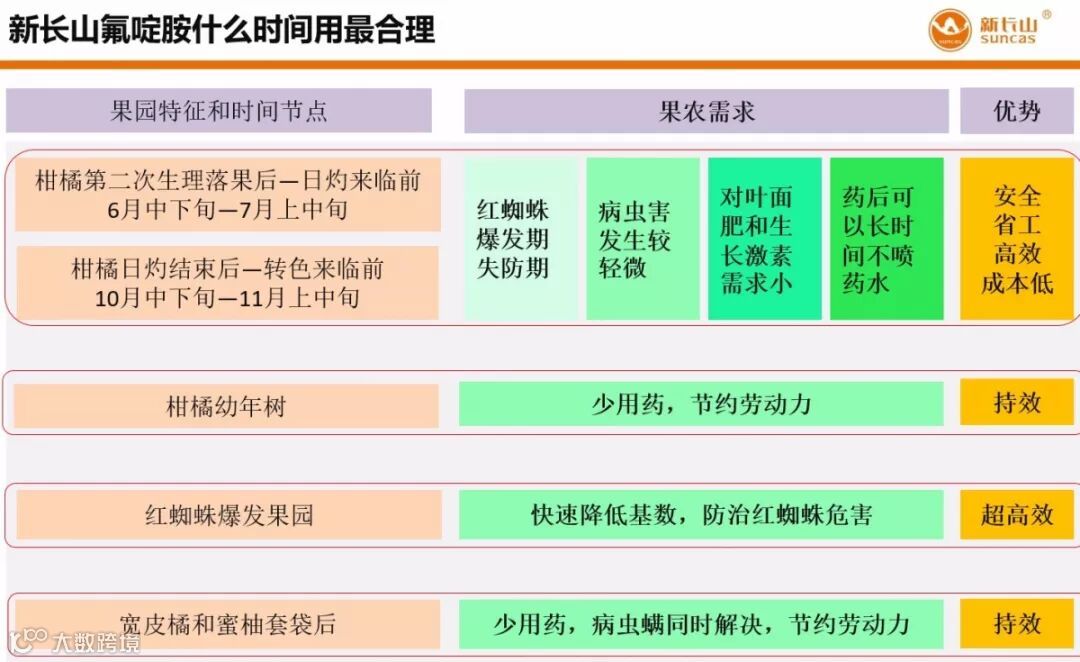 另外因为氟啶胺的没有内吸性和内渗性,所以药效的持效期基本是靠在叶面的分散性和粘着力,2019年上半年,尤其是4月份-6月份,大雨量,没有让这头猛虎发挥出应有的效果,好饭不怕晚,我们需要慢慢等待。同时笔者也建议我们的种植户们在防治红蜘蛛的时候能够选择轮换用药,尽管氟啶胺效果突出,挂果树也只推荐全年两次用药。