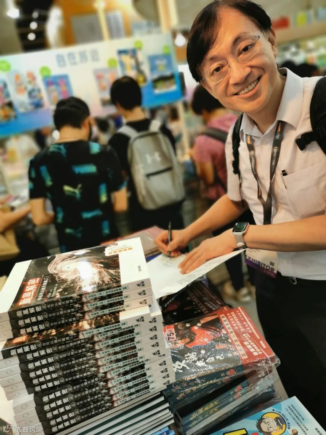 香港天文台前台長、《颱風解密》主編岑智明快閃萬里展位簽書。
