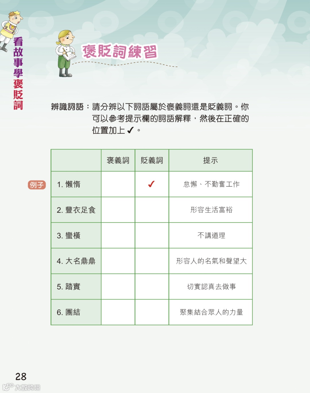 故事後設「褒貶詞小教室」,深入淺出地講解褒、貶及中性詞的特點和常見用法。