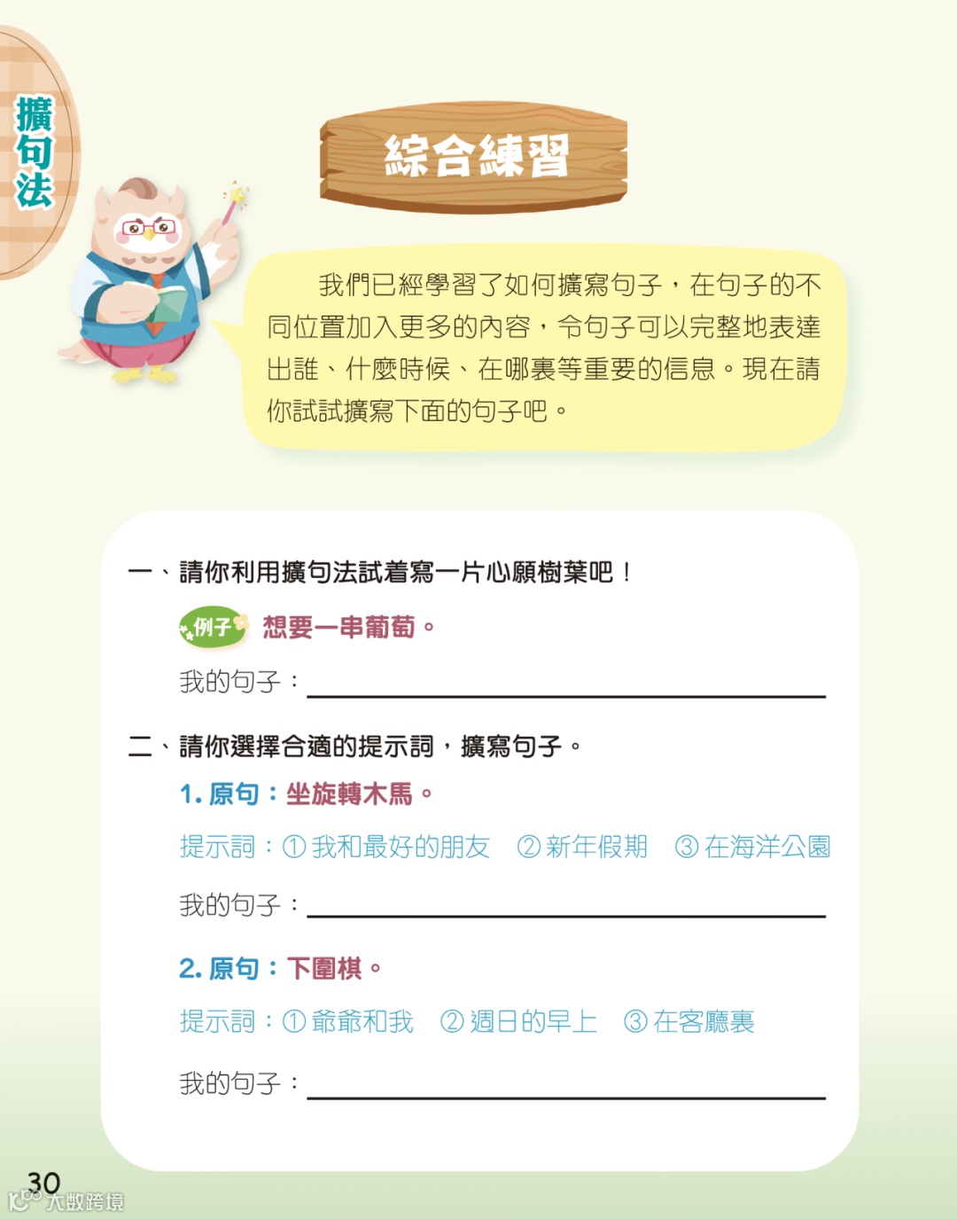 故事後設有「森林寫作班」,用淺白、易懂的語言教授4種寫作必備知識:擴句法、句式和語氣、寫作四要素及看圖寫作技巧。