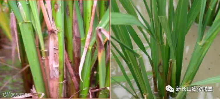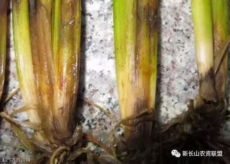 主要危害水稻根节部和茎基部,病株先在近土表茎基部叶鞘上产生水渍状椭圆或长梭形病斑,后渐向上扩展成边缘褐色、中间枯白色的不规则形大型病斑。严重的病株心叶青卷,随后枯黄,酷似螟虫危害造成枯心苗。其独特症状是病株根节变为褐色或深褐色腐烂,极易拔断,并有一股难闻的恶臭味。