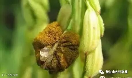 稻曲病病菌只危害稻穗上的个别谷粒,能使被害稻粒变成绿绒状的孢子球,发病稻粒在颖壳的合缝处露出淡黄 绿色的小菌核,菌核膨大后包裹全部颖壳,呈墨绿色,表面光滑,最后龟裂,散出墨绿色粉末。